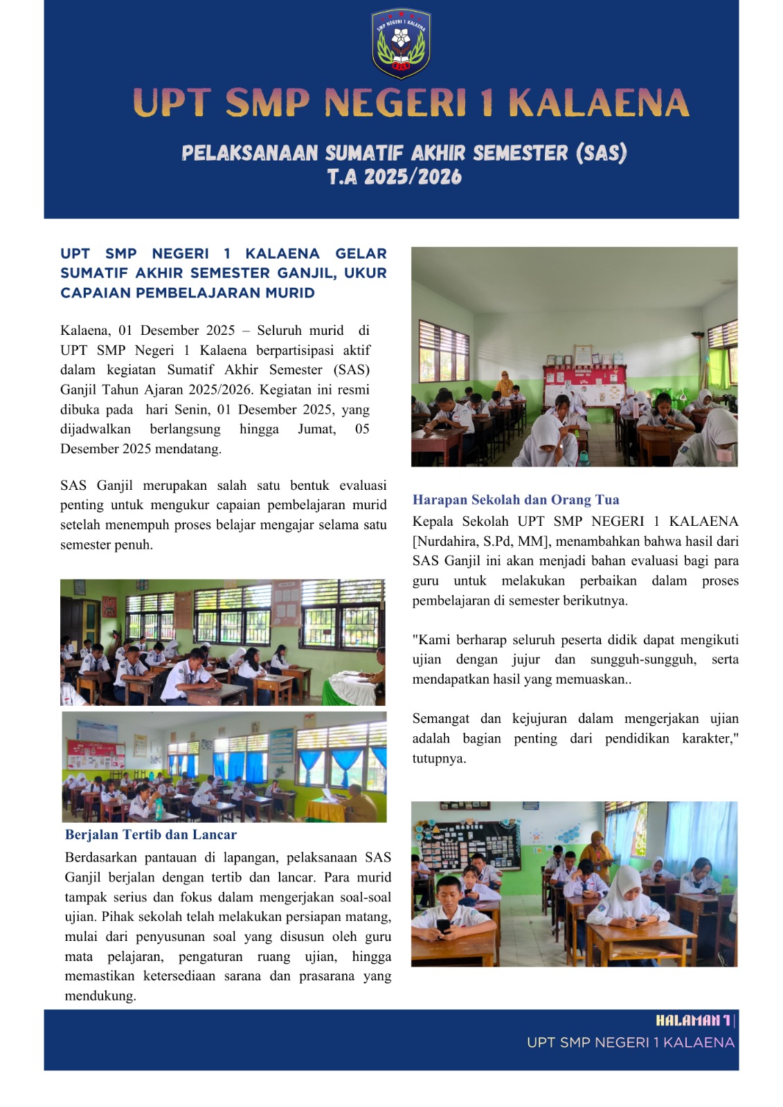 PELAKSANAAN SUMATIF AKHIR SEMESTER GANJIL UPT SMPN 1 KALAENA